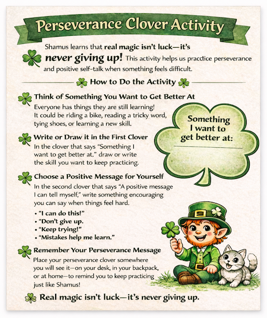Here you’ll find fun, kid-friendly activities—like Perseverance Clovers, breathing exercises, reflection worksheets, and coloring pages—that support emotional growth and resilience. These tools are perfect for parents, teachers, counselors, and caregivers who want to help children learn that mistakes are part of learning and that effort matters more than luck.